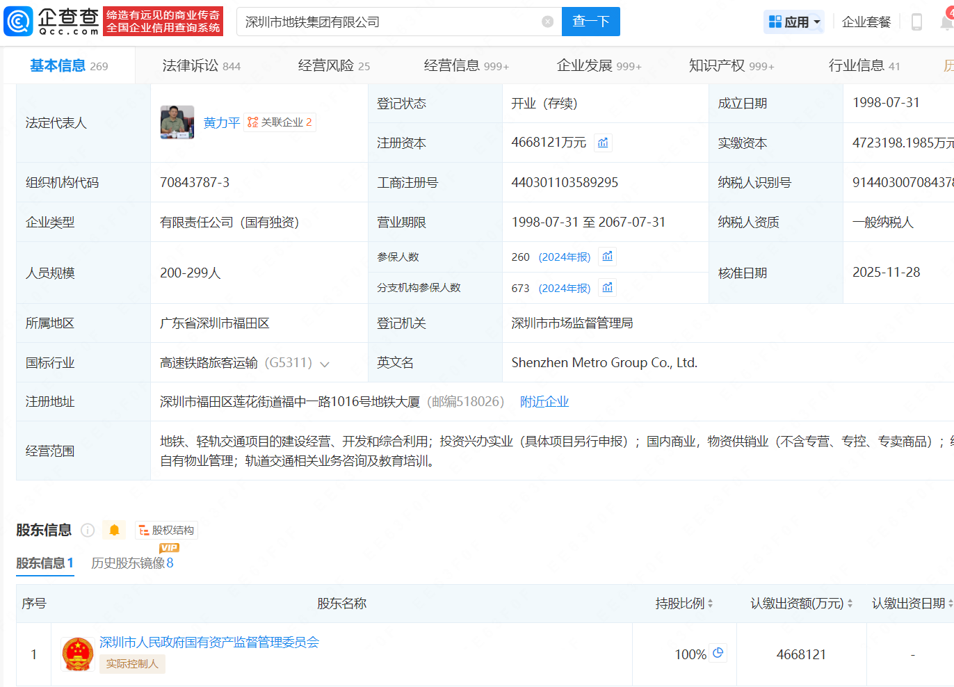 近日,深圳市地铁集团有限公司发生工商变更,辛杰卸任法定代表人,由黄力平接任,同时,黄力平由总经理改任经理。企查查信息显示,该公司成立于1998年7月,注册资本约466.8亿元,经营范围包括地铁、轻轨交通项目的建设经营、开发和综合利用等,由深圳市人民政府国有资产监督管理委员会全资持股。