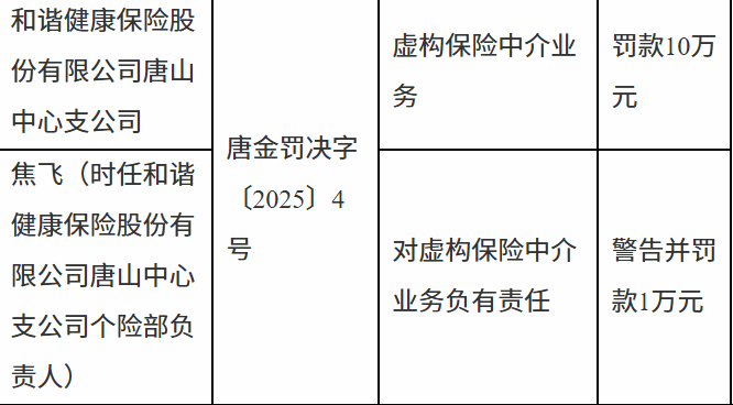 12月1日,国家金融监督管理总局唐山监管分局行政处罚信息公开表显示,和谐健康保险股份有限公司唐山中心支公司因虚构保险中介业务被罚款10万元;焦某被警告并罚款1万元。