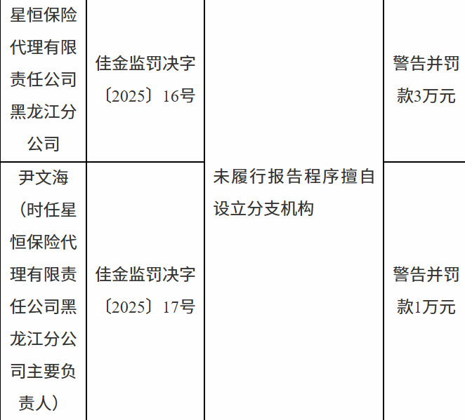12月1日,国家金融监督管理总局佳木斯监管分局行政处罚信息公开表显示,星恒保险代理有限责任公司黑龙江分公司因未履行报告程序擅自设立分支机构被警告并罚款3万元;尹某海被警告并罚款1万元。