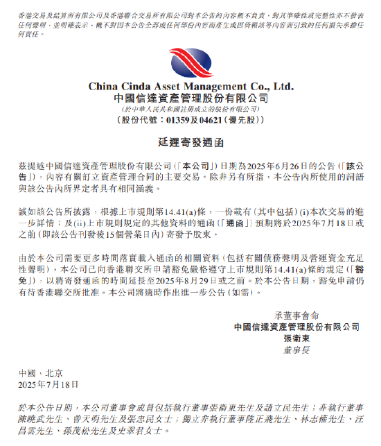 7月18日金融一线消息,中国信达资产管理股份有限公司发布公告,披露其延迟寄发通函的事宜。该公司曾于2025年6月26日发布公告,内容涉及订立资产管理合同的主要交易。根据上市规则第14.41(a)条,原计划在2025年7月18日或之前(即6月26日公告刊发后15个营业日内),向股东寄发包含该交易进一步详情及上市规则规定其他资料的通函。