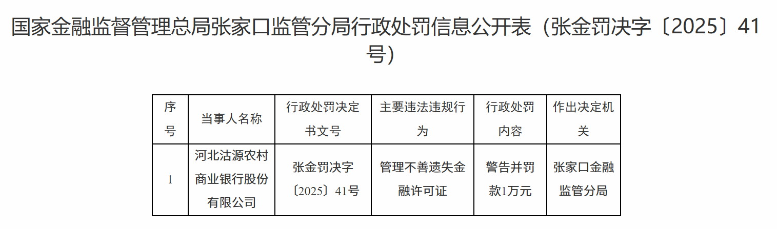 12月1日,国家金融监督管理总局张家口监管分局行政处罚信息公开表显示,河北沽源农村商业银行股份有限公司因管理不善遗失金融许可证被警告并罚款1万元。
